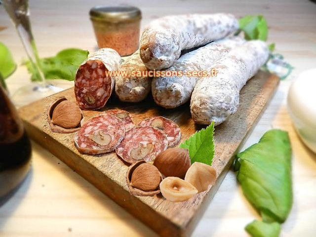 Des noisettes entières sont incorporées à la mélée avant l'embossage du saucisson sec. Au séchage, les noisettes libérent leurs arômes dans la chair du saucisson. Comme pour tous les saucissons secs en vente, le saucisson aux noisettes est sans colorant et embossé dans un boyau naturel.