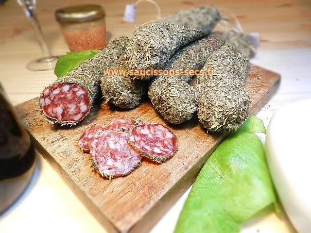 Ce saucisson sec est enrobé d'un mélange d'herbes de Provence (thym, romarin, sarriette, origan et basilic). Durant le séchage, les saveurs de ces herbes aromatiques (surtout le thym, saveur dominante) imprègnent la chair du saucisson, lui donnant ces notes parfumées. Comme pour tous les saucissons secs en vente, le saucisson aux herbes est sans colorant et embossé dans un boyau naturel.