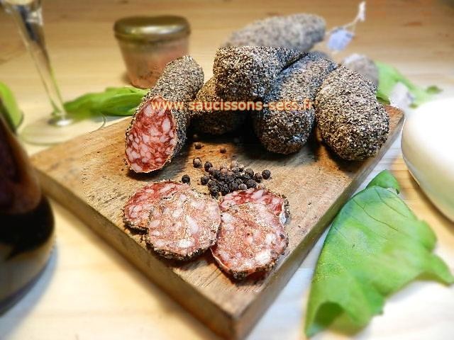 Enrobé de grains de poivre concassés, le saucisson sec au poivre est un des plus parfumé de la gamme. Durant le séchage, les saveurs du poivre imprègnent la chair du saucisson lui donnant ces notes épicées et piquantes. Comme pour tous les saucissons secs en vente, le saucisson au poivre est sans colorant et embossé dans un boyau naturel.