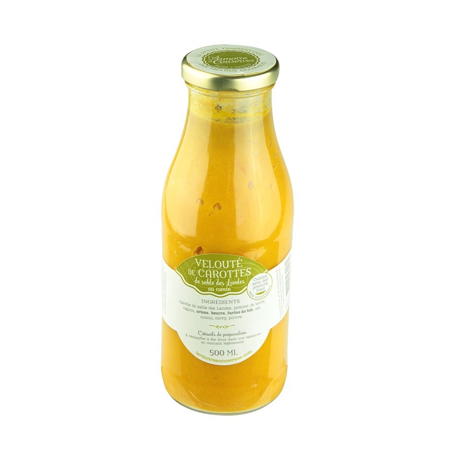 Description: Une bouteille de velouté de carottes au cumin "fait maison", pour un moment de réconfort. Il convient parfaitement à un régime végétarien, il allie la douceur de la carottes à celle de la crème fraiche.