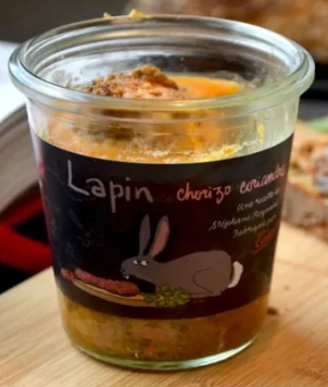 Une terrine authentique de Stéphane Reynaud regroupant 3 ingrédients : Lapin, chorizo et coriandre.